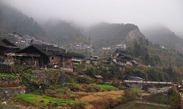 整個寨子大約有幾十戶人家,散落在一道山澗兩側的山坡上。彎彎曲曲的小路,剛剛用水泥砌過。山澗上的鐵索橋也是嶄新嶄新的,游客走在上面搖來晃去,心疼的苗寨導游小姑娘直喊:不要搖啦!不要搖啦!會搖得我們寨子越來越窮的!這可是我們集資建的橋啊!