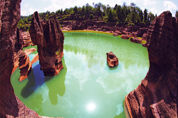 沿著正在鋪設的碎石路,紅石林風景區收費門襤出現,門臉還沒修好,門票50元。望著眾多的山麓,不知道往哪走風景最佳,一位當地的老漢,自告奮勇給我們當導游,一路上他給我們介紹景點,唱山歌,還幫我們照相,走出石林給了老漢20元錢。老漢介紹,紅石林的石頭造型各異,顏色變化多端,且隨天氣、時間、季節變化而變化,晴紅雨黑,陰轉褐紅,晨昏有別,如此奇特的“變色石”天下獨一無二,世間僅有,實為難得一見之自然奇觀。頭天剛下過雨,雨后的石林空氣過濾了一般,深深的吸一口氣,感覺到絲絲甜意。諾大的石林中好象只有我們一批客人,老漢帶著我們沿著山路進入了紅石林中,石柱高低起伏,有的隱藏在樹林里,有的矗立在田埂上,被雨水沖刷過的紅石林,在陽光的照射下,紅色越來越深,揀起地上的一顆碎石,它曾經是大海里的一粒沙,卻變成劍狀,柱狀 ,蘑菇狀的石林,園里每一座石柱都是一個雕塑。層層疊疊的石柱,配上翠綠的樹林古老藤蔓,煞是好看。