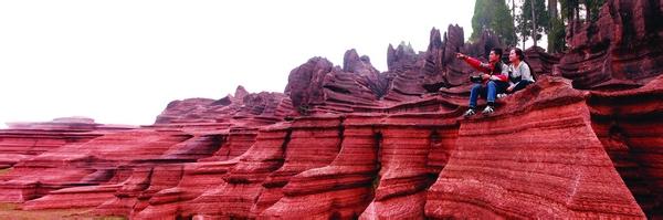 石林距古丈縣城26公里,湘西著名人文景觀——芙蓉鎮就在紅石林的對岸。那遍布的紅彩奇石造型各異,姿態萬千,或依山而立,或拔地而起,古樸秀雅,氣勢宏偉,身臨其境,恍如仙境。一尊高 12.6米的擎天石柱,猶如一東方巨人,指點江山;巨石對面,另一石則婀娜多姿,秀麗動人。另有一山頭遍布紅石,或高或低,或長或短,游人入此,頓覺撲朔迷離,難覓來路。入另一處石林,但見如墻似垣,高度不大,但排列組合得與樓蘭古城布局相差無幾。這里所有的石頭都披著一層細密的皺褶,如珊瑚礁一般,讓人想起幾萬年前這里是一片浩闊的大海,海浪時時轟鳴著一波波沖擊著礁石。