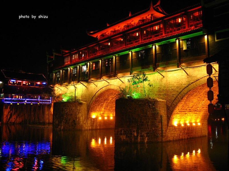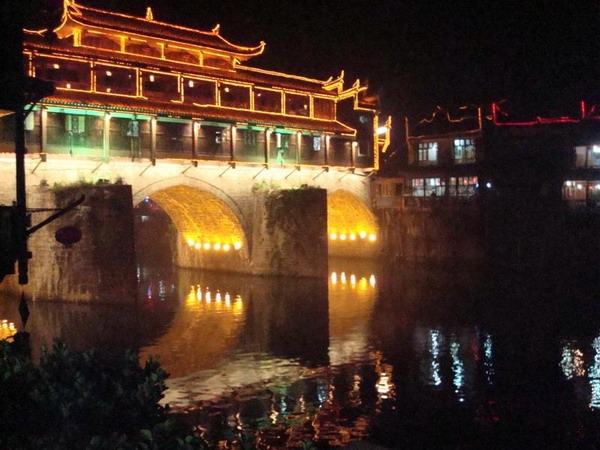 虹橋與民族一條街豎橫交錯,互為輝映,構成了古城市井風俗畫面的,便是虹橋風雨樓。 虹橋橫臥于沱江之上,風雨樓以它的壯觀和俊美拔然而起,這其實就是成了一道重疊的風景,這道風景,由下而上、由古而今穿越著六百多年的歷史。 這座橋始建于明洪武初年,頗信風水的鳳凰人都說,這座橋斬斷的是一條龍頸,令一條巨龍身首異處。怪只怪那位和尚出生的安徽小子朱元璋,聽信一位從昆侖山開始追索一支龍脈,經云貴高原來到五寨司城的陰陽先生的讒言,說這兒屏立南郊氣勢非凡的南華山和與之一脈相承一頭扎入沱江的奇峰,就是他要尋找的龍頭。并由此推斷出總有一天這地方會有人出來問鼎中原,真命天子將出。那位朱皇帝豈能允許邊遠的鳳凰有他潛在的對頭于是朱筆一勾,龍頸被斬,鳳凰風水遭毀滅性破壞,鳳凰再也出不來皇帝了。