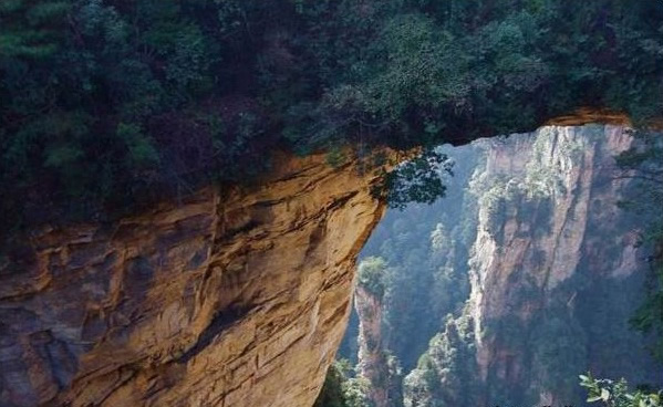 在砂刀溝盡頭右側(cè),袁家界左面南沿,一天然石橋凌空飛駕于兩座巨大的石峰之巔,厚約4米,寬2米余,跨度約50米,相對高度300多米。橋面兩端石峰上,綠樹叢簇,郁郁蔥蔥,峰壁則宛若斧劈,草木不生。立橋邊俯視,透過稀疏樹葉,見云涌霧蒸,幽深莫測。自北端步行過橋,狹窄處僅數(shù)十厘米,心驚卻步。繞過深谷,站在相距40多米處觀橋臺上,橋的全貌映入眼簾,橋身雄奇?zhèn)グ丁?/p>