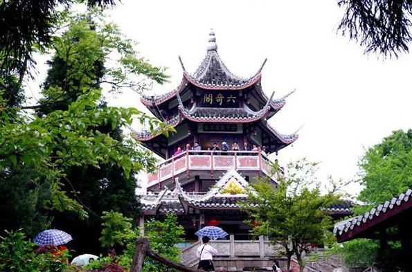 【六奇閣】在黃石寨絕頂,高3層, 以張家界 山奇、水奇、云奇、石奇、植物奇及珍禽異獸之奇名之,為黃石寨最佳鳳景處,1991年10月竣工。