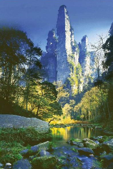 金鞭溪因流經金鞭巖而得名,全長5710米,穿行於絕壁奇峰之間,溪谷有繁茂的植被,溪水四季清澈,被稱為"山水畫廊"、"人間仙境"。有詩贊曰:"清清流水青青山,山如畫屏人如仙,仙人若在畫中走,一步一望一重天"。途中你會看到點歌臺,那里有土家姑娘時刻準備為游人唱民族歌曲,只要付十元錢她們就會為你引吭高歌,當然,如果你不想花這個錢,也可以在一邊聽聽別人點的歌,聽完后走人。