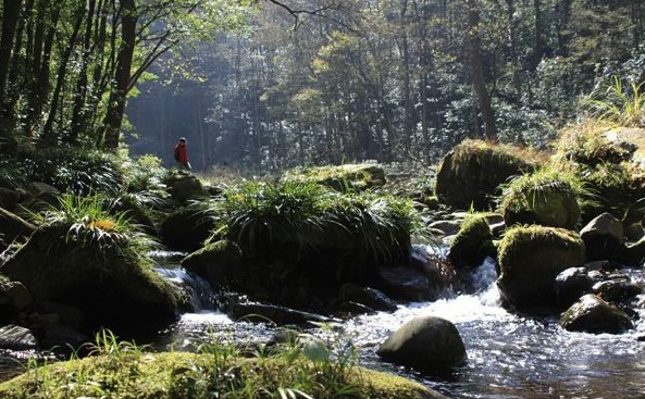 金鞭溪是天然形成的一條美麗的溪流,因金鞭巖而得名。溪水彎彎曲曲自西向東流去,即使久旱,也不會斷流。走近金鞭溪,滿目青翠,連衣服都映成了淡淡的綠色。流水潺潺,伴著聲聲鳥語,走著走著,忽然感到一陣清涼,才覺察有微風習習吹過,陣陣襲來的芬芳使你不由得駐足細細品味。清澈見底、纖塵不染的碧水中,魚兒歡快地游動,紅、綠、白各色卵石在水中閃亮。陽光透過林隙在水面灑落斑駁的影子,給人一種大自然安謐靜美的享受。