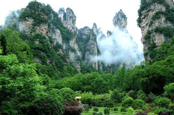 張家界國家森林公園旅游景區圖國家計委批準成立的中國第一個國家森林公園,1992年12月因奇特的石英砂巖大峰林被聯合國列入《世界自然遺產名錄》,2004年2月被列入世界地質公園。公園自然風光以峰稱奇、以谷顯幽、以林見秀。其間有奇峰3000多座,這些石峰如人如獸、如器如物,形象逼真,氣勢壯觀。峰間峽谷,溪流潺潺,濃蔭蔽日。有"三千奇峰,八百秀水"之美稱。公園不僅自然風光壯美絕倫,而且森林植物和野生動物資源極為豐富,森林覆蓋率達98%,是一座巨大的生物寶庫和天然氧吧,被稱為"自然博物館和天然植物園"。草木禽獸與奇山異水,同生共榮,形成完美的自然生態系統。