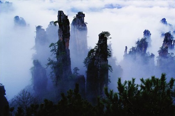 "峰三千,水八百"。這里有三千多座奇峰拔地而起,形態各異,似人似物,神形兼備,令人嘆為觀止。溪流、泉水、飛瀑散布其間,森林茂密,花草遍地。張家界宛如一幅巨大的山水畫。