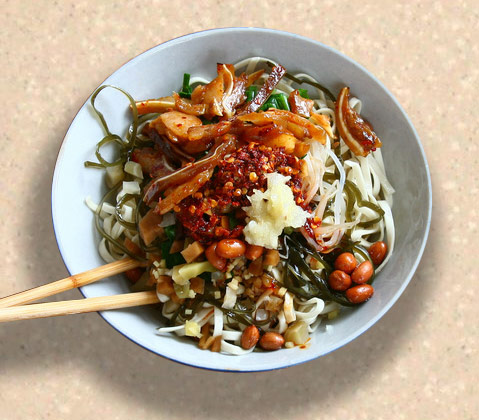 吃涼面在張家界算得上是一道獨特的風景,你走在大街小巷、城郊鄉村,隨處都可見賣涼面吃涼面的。賣的人簡單,一個小小的兩輪車就解決了店面的問題。吃的人形態各異,或座、或站、或蹲、或邊走邊吃,吃涼面的人也不分男女老少,吃涼面的季節也不分春夏秋冬。