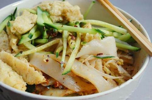 涼皮在張家界比較少見,在張家界綜合商店旁的小巷子口有一家,拌以醬油、鹽、花生、黃瓜絲等作料與拌料,清爽滑口,風味獨特。在炎熱的暑假,吃上一口,身心舒爽。