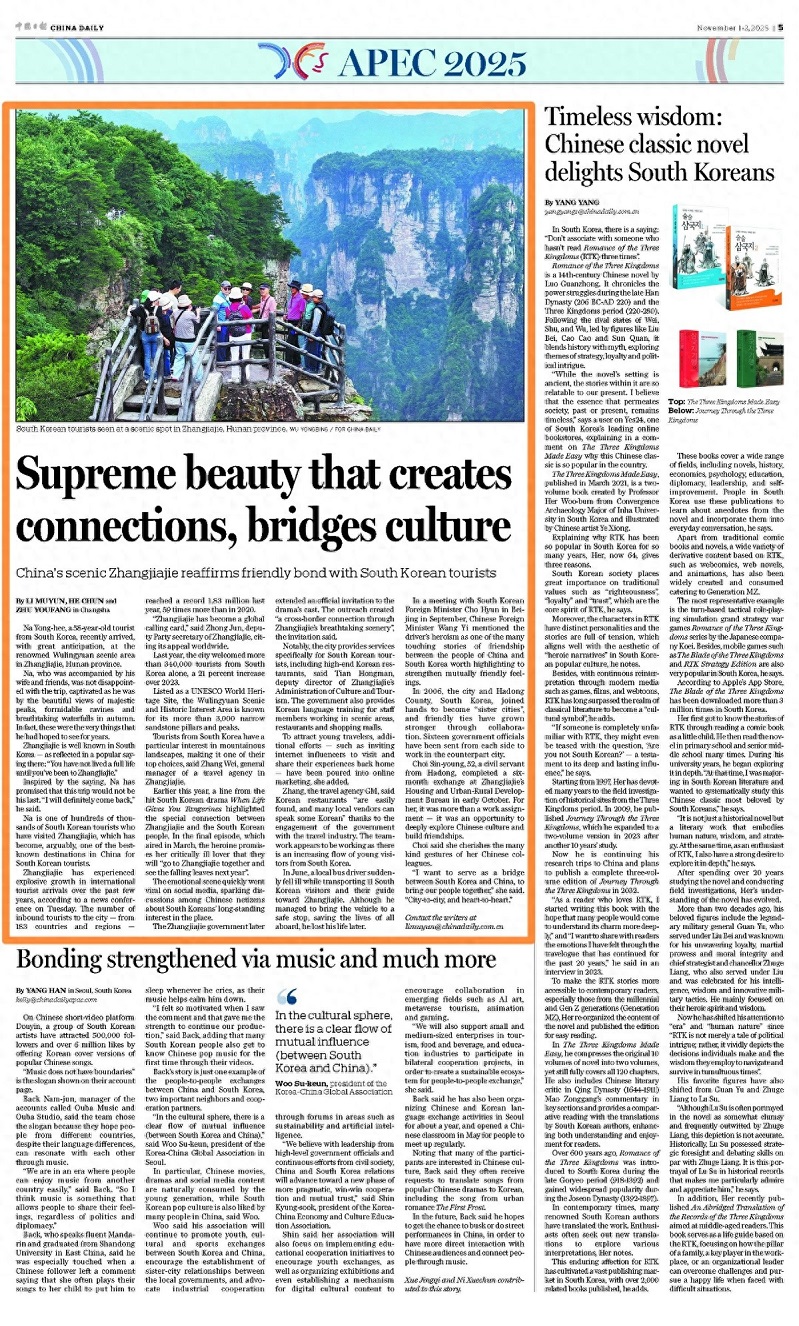 2025年11月1日,在中國領(lǐng)導(dǎo)人出席APEC會議并對韓國進行國事訪問之際,《中國日報》高訪專刊在第五版頭條刊發(fā)報道“Supreme beauty that creates connections, bridges culture”,講述張家界與韓國從民間到官方的友好交流交往故事。