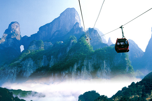 1:天門索道:索道線路斜長7455米,上下站水平高差1279米,是世界最長的單線循環脫掛抱索器車廂式索道,猶如一道彩虹飛渡“人間” “天上”,又像一條巨龍騰翔素云蒼穹,依山籍壁,拔地沖天,蕩氣回腸,恢宏壯觀,成為天門山旅游風景區“四大奇觀”之一。