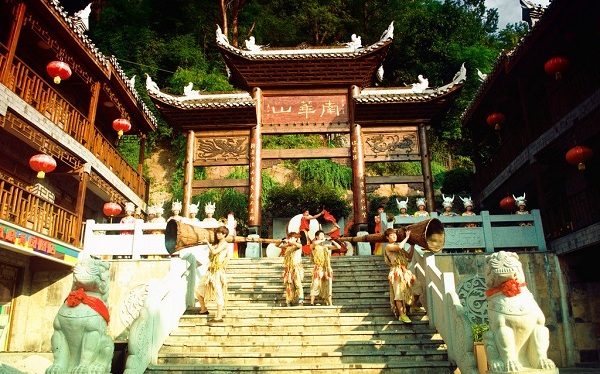 南華山位于湖南省湘西鳳凰古城南面,高七百公尺,共九峰七溪,最著名有虎尾峰、芙蓉巖,是城南一道天然屏障。被稱做南華疊翠 。山上草深林茂,野花地,樹木參天,清泉冽冽,綠樹莽莽,山秀水奇,是鳳凰八景之冠。南華山森林公園,林木競秀,花草茂密,是一座巨大的綠色寶庫。山上有松、杉、柏、竹、椿等用材樹種和水杉、銀杏、珙桐、香果等珍貴植物;有油茶、油桐、板栗、漆樹、楠竹等經濟林木和天麻、靈芝、人參、黨參、百味蓮、野百合等名貴藥材,林海萬物爭榮。南華山森木公園重巒疊障,溝壑縱橫,是一座天然的動物樂園。林麝、山貓、野兔、松鼠、靈猴、竹鼠游戲于山石之間;長尾雉、相思鳥、貓頭鷹、野斑鳩、畫眉、八哥、杜鵑等騰躍于松柏之上,透出勃勃生機。南華山石階路是南華山森林公園的一大景觀。南華山的石階路,表現出的卻是一種像游龍戲水般的曲線動感藝術。石階近2000級,每一級寬2米,高20厘米。石階緣山勢鋪陳,平平陡陡,曲曲彎彎。路兩旁,古樹參天,山花遍地。