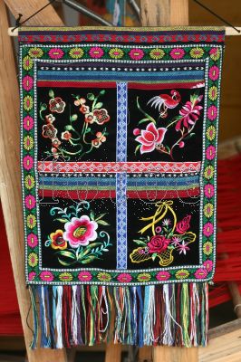 它的織造方法是,沿用古代斜織機的腰機式織法,把經線全拴在腰上,以觀背面,織出正面。這必須對樣式花紋及色彩勾勒有純熟的記憶才能織好。這種織法織出來的產品美觀整齊,結實耐用,光澤永存。它的畫面多姿多彩,用色常借鑒艷麗的鮮花、鴛鴦的羽毛、天空的晚霞和雨后彩虹,色彩秀麗,自然生動;也有的受宗教繪畫的影響,具有素雅、古樸、沉著的特點。在紋樣組織結構上,多以菱形結構、斜線條為主體,講究幾何對稱,反復連續,共有上百種傳統紋樣。