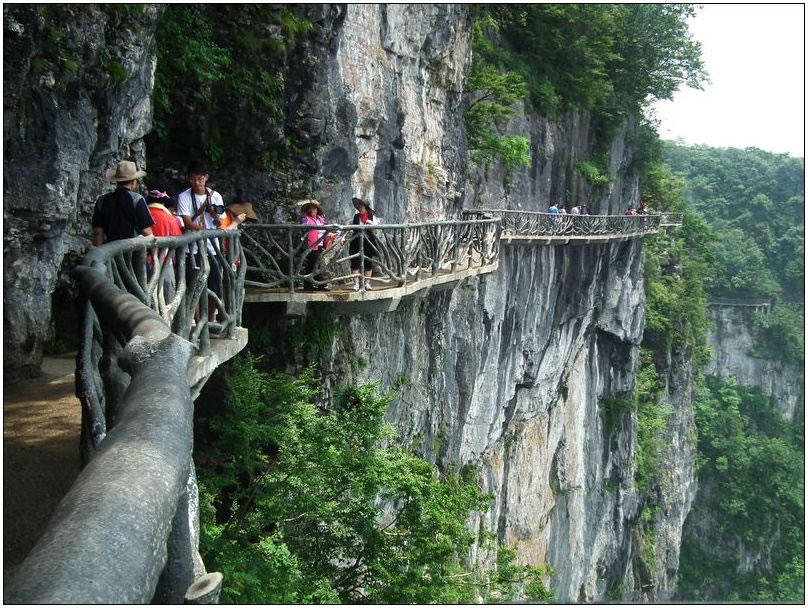 鬼谷棧道,位于天門山西線覓仙奇境景區,因懸于鬼谷洞上側的峭壁沿線而得名。棧道全長1600米,平均海拔為1400米,起點是倚虹關,終點到小天門。在棧道上,挺著發麻的雙腿,帶著急促的心跳,閉上眼,伸開雙臂,你就能得到一次最完美、最刺激、最貼近自然的SPA。據施工人員介紹,此棧道是他們所修棧道中施工最難,最險峻的一條。棧道中還有一個凌空伸出的長約5米的玻璃站臺,這里,沒有鋼筋水泥的阻礙,只有赤裸裸的透明迎接著每個人的尖叫!